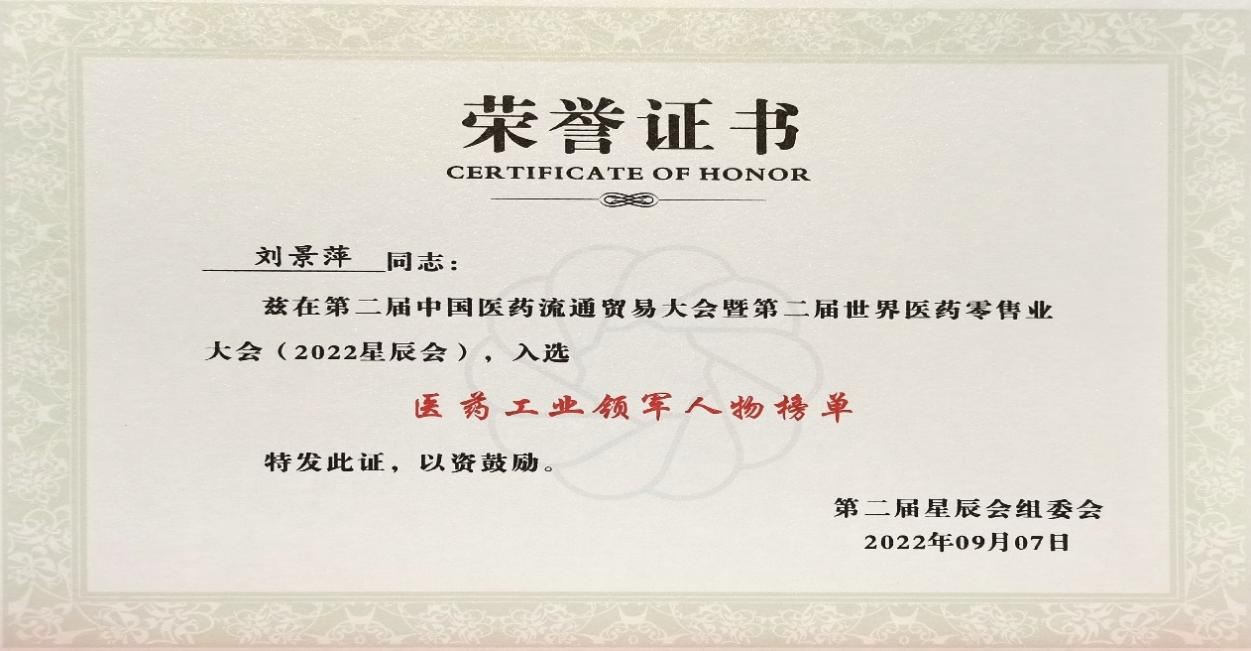 在本次开幕式上,发布了“医药工业领军人物”、“医药零售领军人物”榜单,304am永利集团药业集团刘景萍董事长凭借在儿药领域多年的努力探索和对行业的杰出贡献,荣获“医药工业领军人物”称号。